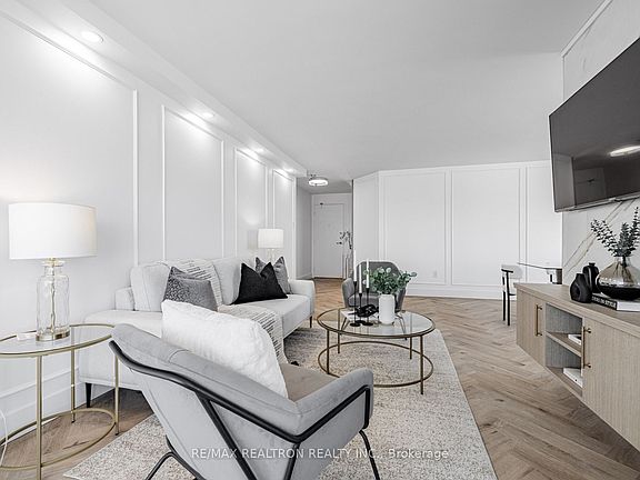 Absolutely stunning and meticulously renovated condo located in the prestigious Promenade Towers, offering approximately 1,250 square feet of luxury living in the heart of Thornhill. This bright and spacious 2-bedroom, 2-bathroom suite showcases top-tier finishes throughout, including elegant herringbone flooring, smooth flat ceilings, pot lighting, and premium window treatments. The designer kitchen is a true showpiece, featuring quartz countertops, modern cabinetry, and an efficient layout thats perfect for both everyday living and entertaining. Both bathrooms have been beautifully updated with spa-inspired elements: premium tiling and faucets, glass enclosed showers, automatic lighting and a private makeup vanity. Thoughtful custom closet systems maximize storage and organization, adding to the homes functionality and style. The expansive living and dining areas are perfect for relaxing or hosting, and include a bonus brand new TV , ready for your enjoyment. Two walkouts lead to an oversized private balcony with sweeping views of the Thornhill skyline, ideal for morning coffee or evening sunsets. This well run building offers low and all-inclusive maintenance fees with a full range of high-quality amenities, including 24-hour security, a swimming pool and indoor whirlpool, a fully equipped fitness centre, a renovated party room, and tennis/pickleball courts. Building is currently modernizing all hallways! Enjoy the convenience of an unbeatable location just steps from Promenade Mall, public transportation, schools, parks, and places of worship. This is a rare opportunity to own a turnkey home in one of Thornhill's most desirable and vibrant communities, where luxury, comfort, and convenience converge.