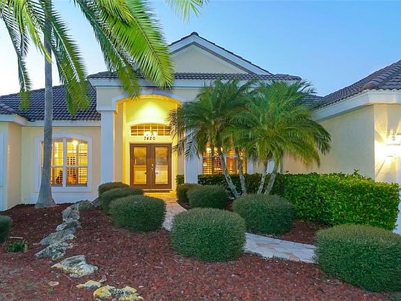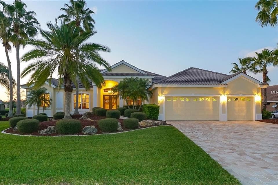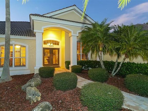 Gorgeous custom built home situated on almost a half-acre golf course lot in River Club. This open and functional one level floor plan offers a spacious great room with fireplace plus a media/bonus room with sliding glass doors to the lanai/pool area. The extended screened lanai offers a large resort-style heated pool, spa plus two large covered areas for all of your outdoor entertainment and gatherings. The den/office is conveniently located near the master bedroom and has an entire wall of built-ins and bookshelves. Retire in the master suite with sitting area, walk-in closet and private master bathroom with separate vanities, whirlpool tub and separate walk-in shower. The kitchen flows into the casual dinette and great room and offers ample cabinetry, hard surface counter-tops, stainless steel appliances, gas range and breakfast bar. Two additional guest bedrooms with "Jack & Jill" bath makes it convenient for family and guests. Other features include: wide crown mouldings, recessed tray ceilings, three full baths, plantation shutters, 3 car garage, brick paver driveway, extensive landscaping on all sides, tile roof, irrigation system, high volume ceilings and much more. River Club is a deed restricted 18-hole Ron Garl-designed golf course community with low HOA fees and NO CDD's. Ideally located with short distance from excellent schools, Lakewood Ranch Main Street, shopping, UTC Mall and Lakewood Ranch hospital. Convenient I-75 access to downtown Sarasota, sugary sandy beaches, St. Pete and Tampa.