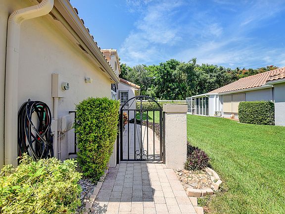 This is a wonderful opportunity to own a 2-bedroom, 2-bathroom home with a den/family room in the highly desirable Wedgewood Village section of The Cascades, a sought-after 55+ community located in Boynton Beach. The main living area of the home is tastefully tiled with neutral colored tile, which not only adds a touch of elegance but also makes for easy maintenance. There are vaulted ceilings which enhance the spaciousness of the home, giving it an open and airy feel. The kitchen is equipped with white cabinets and additional built-in cabinets with a desk area. There is a newer stainless refrigerator and microwave oven. The primary bedroom boasts a generously sized walk-in closet, offering plenty of storage space for your belongings. The primary bathroom has an updated vanity with with extra storage and pull-out shelves. As well as a granite counter-top. Enjoy a private outdoor space in the form of a patio, perfect for relaxation, entertaining. There is a separate laundry room right in the house, making laundry tasks more efficient. The home comes equipped with accordion hurricane shutters, providing peace of mind during storm seasons.