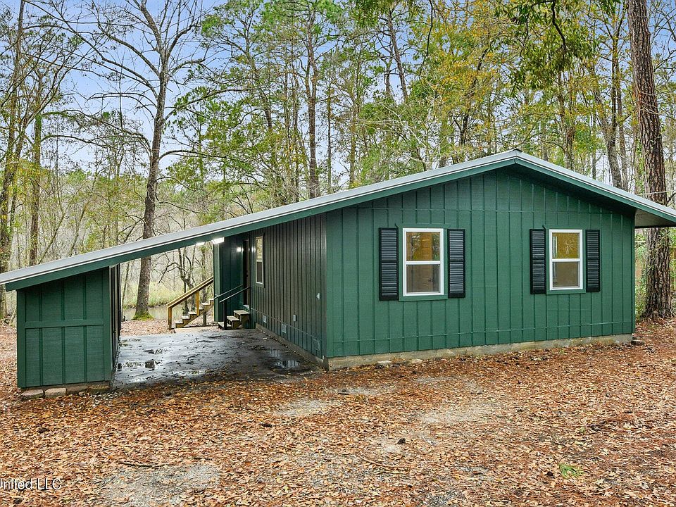 Serenity awaits - Come and see this totally updated 3 bedroom home tucked away in a wooded setting on the water's edge. Highlights include a brand new metal roof, fresh interior and exterior paint, and a full kitchen with brand new countertops, cabinets, and stainless steel appliances with a large bar that overlooks the spacious living area making it possible for you to stay connected with your family and guests. Speaking of the living area it is an open and airy space with vaulted ceilings and two brand new sets of sliding glass doors that let in plenty of natural light and provide an amazing view over the back deck and down to the water. In addition, the home features a stylish bathroom with a brand new vanity, toilet, and a shower/tub combo. All the bedrooms have large fans to keep you cool and brand new windows have been placed throughout the home to help with efficiency. This home is conveniently located north of I-10 and does NOT sit in a flood zone. Make the jump and make this home yours TODAY!