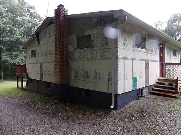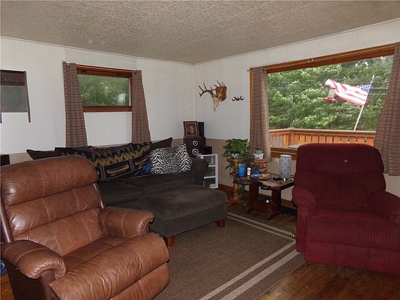 Project home in nice location with over an acre of land. This one-story home features living room, 2 bedrooms and mud room with hardwood flooring; kitchen with ceramic tile flooring and appliances included; and bath in need of updating. Full basement with laundry appliances included, as well as an additional new hot water heater. The home is serviced with a 3 year old coal/wood furnace and there is a propane wall unit in the living room. The exterior has T111 siding on 2 sides and needs to be completed on the remaining 2 sides. There is a large front deck. A three-unit storage building provides for some additional income, as all units are rented on a month to month basis.