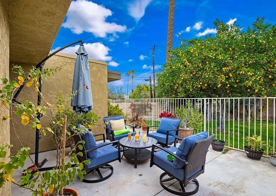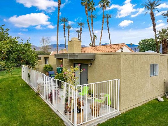 Welcome home to the gated community of Portola Village in South Palm Desert, just a mile from El Paseo, the Beverly Hills of the desert. Portola Village is a quiet, small development of only 46 homes with a community pool, spa, and tennis courts. This lovely condo at the end of a cul-de-sac has a large open kitchen, a generous-sized living room with a fireplace for cool winter evenings, two spacious bedrooms and bathrooms, and freshly updated wood-look plank flooring. A fantastic bonus is a private back patio that overlooks an attractive greenbelt with mature citrus trees and a mountain view. The two-car garage has plenty of storage and shelving. Close to world-class golf, tennis, pickleball, shopping, hiking, biking, theaters, spas, and all that the desert offers. Perfect for a vacation home, rental property, or primary residence. Low HOAs to boot.