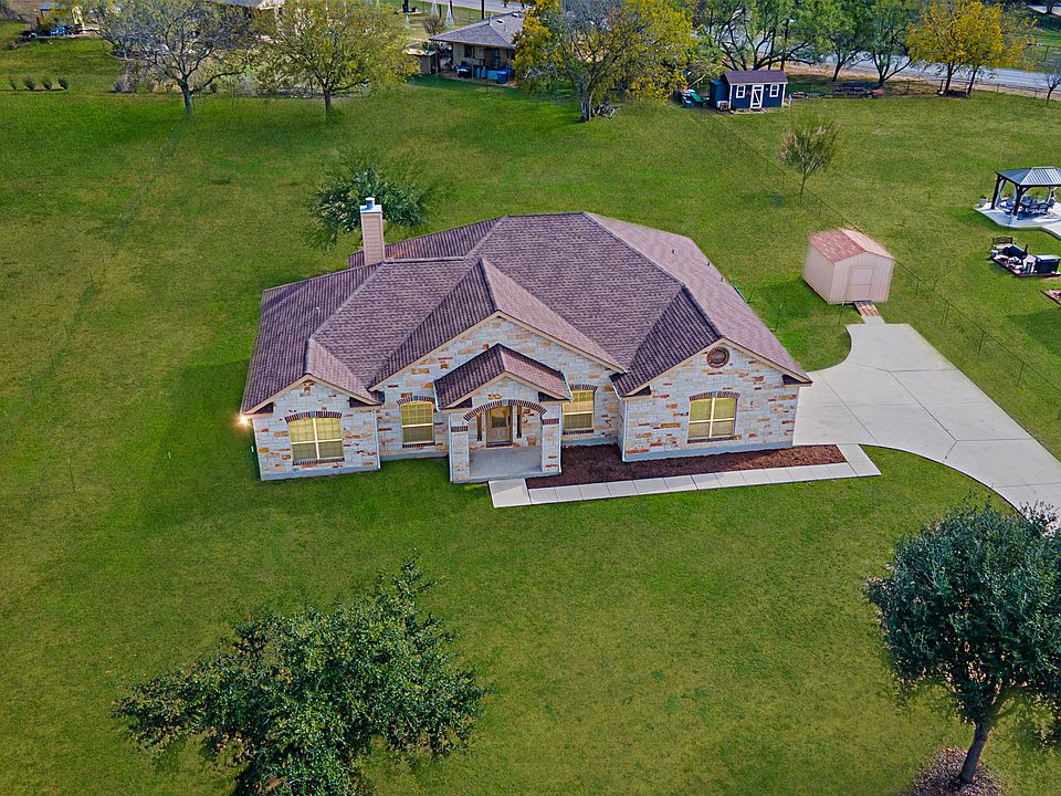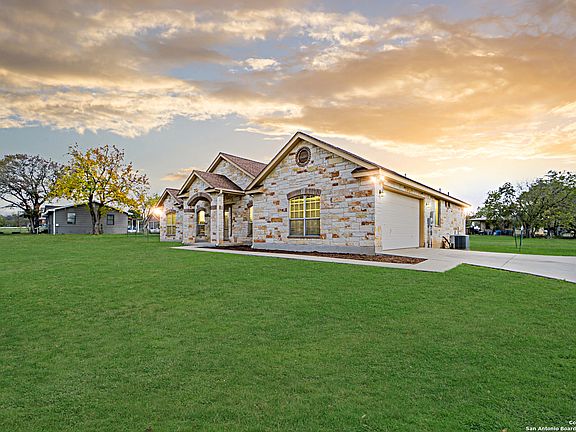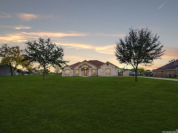 OPEN HOUSE 12/18 Noon to 4pm. This custom 3 bedroom 2 bath home is over 2,100 sq ft on just under an acre. There is an office that could be a 4th bedroom, formal dining room, breakfast dining area, and stone wrapped breakfast bar. The kitchen boasts granite countertops with tile backsplash, custom wood cabinetry, recessed lighting, and walk in pantry with frosted door. The floors through out are tile with a unique accent at the entryway. The spacious primary suite has plenty of natural light, ceiling fan, new carpet, and crown molding. The primary bath includes a his & her vanity split by powder seat, garden tub, huge walk in closet with built in shelving, floor to ceiling wrap around tile shower with seat, and private commode. The living room has a stone wood burning fireplace that has never been used, coffer ceilings with crown molding, ceiling fan, and plenty of natural light. Secondary Bedrooms all have new carpet, ceiling fans, crown molding, and large closets with built ins. The utility room has custom cabinets with granite countertop, emergency drain, and clothes rack. Additional bonuses include fenced backyard, 27x10 covered back patio, upgraded insulation package, 4 side masonry, finished two car garage, storage shed, concrete driveway, 2.5 blinds through out, gutters, and is preplumbed for a water softener. Country feel yet only minutes from San Antonio. No HOA!