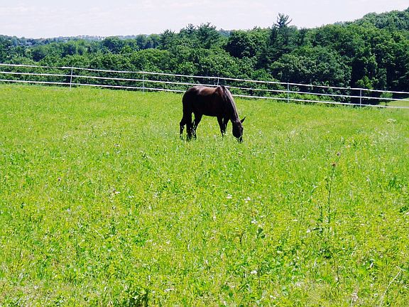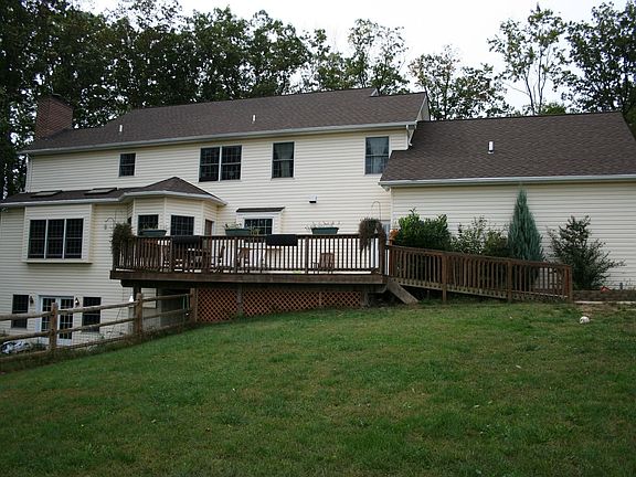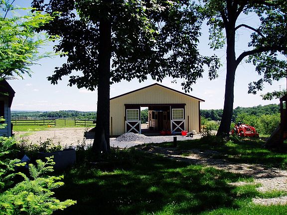 Stunning 3300+ sq. ft. Posocco built home on 13+ acre horse farm. This 5 BR, 3 BA Farmhouse features a 8 ft. wide wrap-around porch, first floor bedroom with private bath perfect for an in-law suite or study, large eat-in kitchen with center island opening to a 28 ft. X 16 ft. deck, family room with Harmon pellet insert in fireplace and hardwood floors throughout first floor. The 2nd floor has 4 BR with open loft and a master with 21 ft. X 27 ft. private den rady to be finished. The walkout basement features 8 ft.+ ceiling and a pellet stove with 300 lb. capacity. The 30 ft. X 30 ft., 4 stall barn with tack room and separate water room (hot/cold) opens to a 60 ft. X 120 ft. outdoor riding arena and connects to a 3 acre fenced-in pasture with 2 small and 1 large areas surrounded by flex fence with electric. A riding path separates the open pastures and the wooded areas. Plenty of uses for the one-of-a kind beauty.