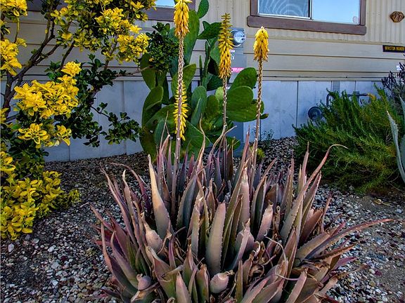 Welcome to your dream retreat in the quiet, well-maintained 55+ Aztec Estates! This beautifully updated home is perfectly positioned at the end of a peaceful cul-de-sac, offering unobstructed views of the desert and mountains that create a serene backdrop for everyday living. Step outside to enjoy the mature front garden filled with native plants, or relax on the spacious covered porch, ideal for warm summer evenings. The large, fenced backyard offers privacy, space for gardening, and those same sweeping desert views. Inside, you’ll find a light-filled open floor plan with expansive windows that invite the beauty of the outdoors in. Recent upgrades include high-end vinyl plank flooring in the main living areas, hall, and laundry room, plus new plush carpet in the bedrooms. The entire interior has been freshly painted, giving the home a crisp, modern feel. The kitchen is a cook’s delight, featuring new butcher block countertops, a new stainless sink and faucet, maple open shelving, a new tile backsplash, and a new stainless steel gas range. A newer stainless steel refrigerator is also included. Enjoy ambient lighting with new light fixtures throughout the home. Additional features include: new window coverings, new Broan furnace & central A/C, dedicated laundry room with washer & dryer, covered carport parking, and access to a sparkling community pool. This is your chance to own a move-in ready home that offers modern comfort, stylish updates, and a peaceful desert lifestyle in a welcoming 55+ neighborhood. SoCal Gas conducted an energy update November 2024 and installed 1) Front door insulation 2) CO2 & smoke alarms in each room which are good for 10yrs 3) Low flow shower head and faucet filters. Purelife water filters in kitchen sink and fridge. Water filter has been installed outside the unit to filter water in the house. Filters to be changed every 6 months. Fridge is also plumbed for ice but not connected. 14 month full Home Warranty included with purchase!