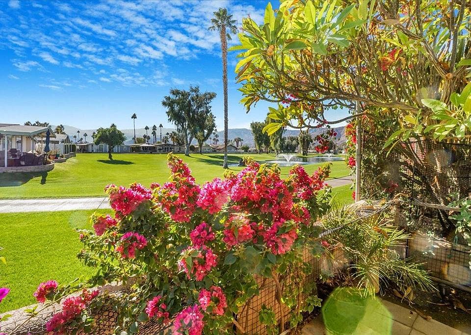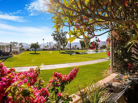 Fabulous remodeled view home in gated 55+golf community. New CAC,newer roof,attached garage!. This 1800+3Br has been lovingly remodeled with the eye of an artist for both quality & visual aesthetics. Bamboo floors, high ceilings throughout with recessed lighting give the home a very open & welcoming feel. The LR boasts a flagstone fireplace flanked by custom floating shelves. Enjoy abundant southern light & views from the beautiful dual-pane windows across the entire front of the LR,DR & kitchen.Remodeled gourmet kitchen for entertaining & sliding doors leading to your ''Alfresco'' dining. There is a bonus Studio for art, gardening or hobby projects. The primary BR has a large walk-in closet, & a dream bathroom with custom dual vanity & spacious tiled shower with seating & double shower heads.Guests will enjoy their remodeled bath as well. The laundry room leads directly into the garage with workshop, sink, storage & included golf cart!New Assumable Solar Lease ,permanent foundation .Portola CC is a 55+Active lifestyle with 18-hole-part-3 golf, clubhouse, 3 pools,pickleball & bocce courts included in a low HOA fee. Your Own Your Land as well. Close to El Paseo's Restaurants & shops & nearby Eisenhower Hospital. Surrounded by gorgeous mountain vistas- See what Portola CC has to offer!