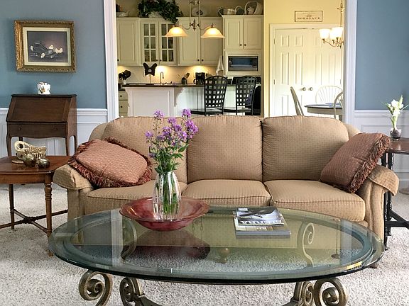 Welcome to 7426 Falls Ridge Ct, a charming French Country style one and a half story home. This was the builders personal home and is packed with extras! Enter into a lovely two story foyer with hardwod floors, wainscoting, and stairwell. The formal living and dining rooms have deep crown molding and plenty of natural light. The eat-in kitchen has been updated with white cabinetry, hardwod floors, and stainless appliances and has plenty of space for your breakfast table and chairs. The great room with vaulted ceiling and impressive fireplace is spacious yet comfortable. The master bedroom is on the other side of the great room and these two rooms share a gas fireplace. The master bedroom is spacious with deep crown molding and has a lovely view of the back yard. The master bath has