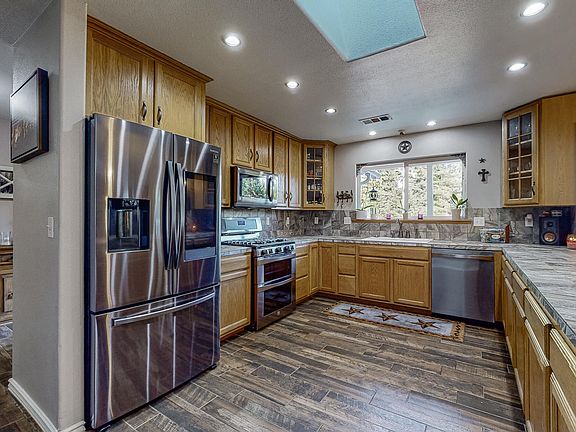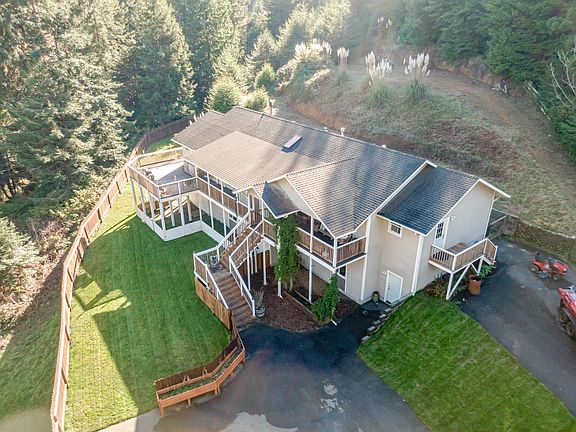 Stunning 2 story Custom Home on over 5 Acres. 2400sf main 2nd level features 4 beds, 2 baths. Custom plank tile flooring, barn doors & brand new carpet throughout. Large open concept living area with cathedral ceilings, barn wood, river rock hearth & wood stove. Open dining area features custom built in Saltwater Aquarium & french doors which open to expansive Deck. Chef's kitchen will not disappoint! Gorgeous custom tile countertops & cabinetry, brand new black stainless appliances & large pantry. Large Primary with walk in & en suite, and Large laundry/mud room with separate entry complete the 2nd level. 1st level is 1200sf fully enclosed open concept shop space with unfinished 1/2 bath. Additional 2 bed 1 bath home sits on property with separate driveway, easy offset to the mortgage!