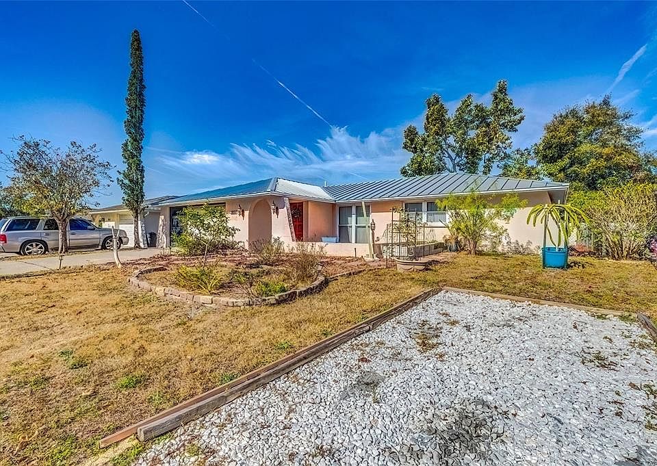 This 2 bedroom, 2 bath, 2 car garage home is nestled in a quiet neighborhood with NO HOA, No Flood zone, NO previous water intrusion or storm damage. NEW Metal ROOF (2022), NEW AC (2022), Newer DOUBLE HUNG Low-E TILT WINDOWS, ALL NEW APPLIANCE (2024) include Refrigerator, Stove, Microwave, dishwasher and the WASHER AND DRYER, CUSTOM FITTED STORM SHUTTER (including the screen room) Everything needed to make this home worry-free from some of the top replacement items for years to come. As you approach the house, you will notice a charming outdoor patio area and spacious front yard. Your going to love the open floor plan as you walk in the front door. You are greeted with a huge Formal Living/dining room area that will lead to an eat-in Kitchen and a breakfast bar w/Corian counter tops that looks over the rear family room. Off the kitchen you will find extended pantry cabinets for extra cabinet space and a newly upgraded bath. The back family room will then lead you out the sliders to the screened lanai (also fitted for storm shutters) great for sitting out and enjoying enjoying your morning coffee or evening cocktail and fully fenced backyard. The oversized garage has Screened sliders that are removable as well as extra shelving that is perfect for storing your tools, lawn and garden supplies etc. The seller had 5 chickens (no roosters) and decided to upgrade to a larger lot. As a result they have strategically priced the home so that any improvements wanted or needed will only add equity and value. The possibilities here are endless. A short commute to Tampa via the Suncoast Parkway/589 toll road, some of the most popular locations along Florida's West Coast such as world renown Beaches, Shopping malls, Restaurants, Movie theaters even Weeki Wachee springs to watch the mermaids and much much more. Schedule your showing today.