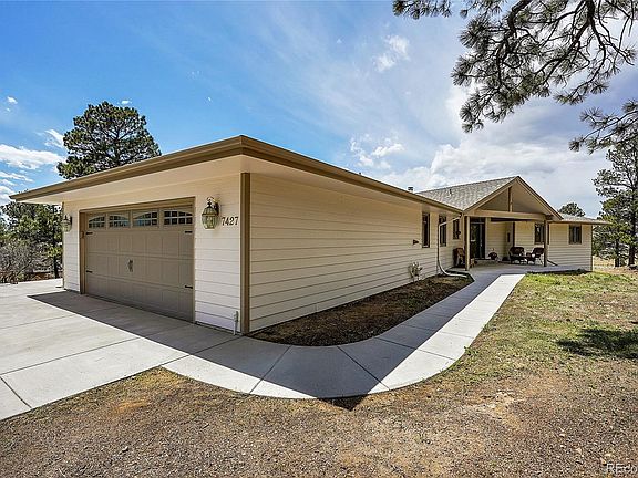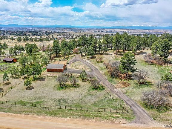 Location location location on this 5.2 acre turnkey horse property only 9 minutes from the town of Parker. Equestrian lovers you're going to love the west side of this property as it has a 20 foot bridal path which connects to an extensive trail riding system. Come see the best lot in Hidden Village as it features beautiful unobstructed front range mountain views in the pines. Hidden Village has a private neighborhood riding arena, riding club & privately owned bridal paths. Remodeled kitchen with knotty Alder cabinets, crown molding & full endcaps, roll outs, soft close doors and drawers, custom cabinet pantry with roll outs, hickory hardwoods, unique slab granite, custom stone backsplash and stainless appliances with convection oven. Enjoy your stunning mountain views from your great room that features vaulted ceilings, solid wood Anderson patio door with double lock system, hickory hardwoods, new ceiling fan w/ light, abundant windows and updated wood burning fireplace. Main floor primary bedroom features oak hardwood floors, new ceiling fan w/ light, walk in closet and breath taking mountain views. 3/4 primary bath is partially remodeled with custom granite, oak vanity and jetted shower! Spectacular 36x36 3 stall could be 4 stall cedar barn with water hydrant and electricity, canopy and custom pipe fencing. Stablemaster stall with 2-1/2 inch spaced bars to contain barn cats when necessary. Custom built 60 foot long pipe pens, 5 foot tall w/ hydrant & electricity. 2 Fenced pastures and more acreage available for grazing. Newer 5 year certified, class 4 hail resistant roof, exterior paint, hot water heater & furnace completed within the last 2 years. Discover this quintessential horse property in the heart of Parker Colorado, your equestrian forever home that comes with abundant turkey & deer too! Come walk the property, appreciate the barn amenities and enjoy the views from inside the home. You'll love it ALL and will look forward to calling it home!