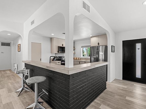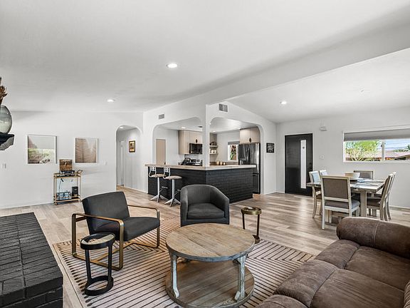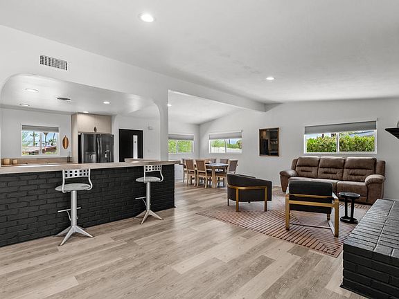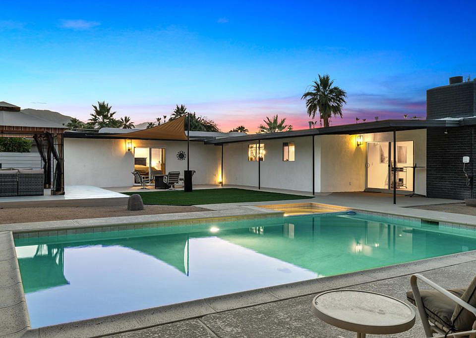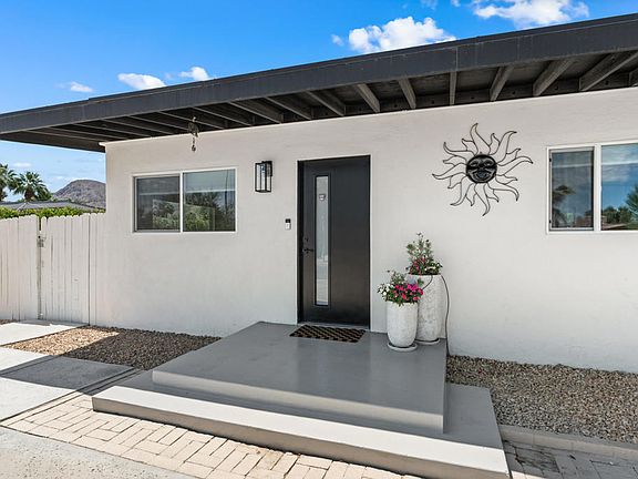 Perfectly positioned in the heart of South Palm Desert, this tastefully reimagined Mid-Century Modern residence offers a seamless blend of timeless architecture and contemporary upgrades. Set on a spacious 1/4-acre lot, the home showcases clean lines, vaulted ceilings, and an effortless indoor-outdoor flow--all set against a backdrop of mountain views and desert skies. Inside, the open-concept layout features soft-toned flooring, a sleek fireplace with a modern black surround, and a beautifully upgraded kitchen with new cabinetry, solid-surface countertops, and premium appliances. The home offers three bedrooms and two fully renovated baths, including a luxurious primary suite with direct pool access, a walk-in closet with custom storage, and a spa-inspired bath featuring a hydro-tub and oversized walk-in shower. Outside, the south-facing backyard is a private oasis with newly resurfaced pool and spa, fresh desert landscaping, updated pool equipment, and covered patio for al fresco entertaining. Whether you're envisioning a serene personal retreat or a versatile investment opportunity, the generous lot offers abundant space for expansion, vehicle storage, or the addition of an accessory dwelling unit--preliminary plans for which are included in the sale. Situated within the desirable Washington Charter School district, close to the Living Desert and just minutes from the boutiques and dining of El Paseo. This is desert living with style!