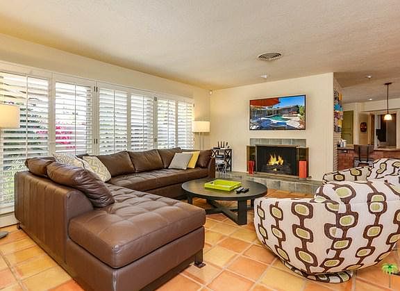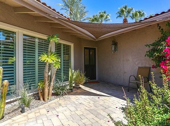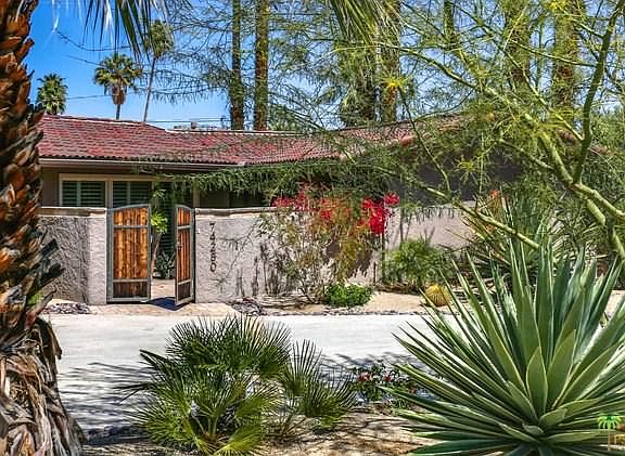 Furnished & move-in ready! Spectacular 3 bedroom home, all en suite, with open concept, living room & family room with fireplaces, dining room overlooking pool/spa. Saultillo tile throughout home creates a warm, casual elegance, with easy maintenance. Master bedroom w/fireplace, access to pool & spa, updated bath w/double vanities, walk-in shower, large walk-in closet w/organizers & separate locked owners closet. Second master on opposite side of home also has direct access to pool/spa, & attached updated bath. Guest room also has attached updated bath, located at the southeast corner of home. Chef's kitchen has stainless appliances, Thermador range and range hood, granite counters and updated cabinets. Laundry room with additional storage is between kitchen and attached garage. Family room with fireplace has adjacent zen-like covered patio with water feature. Enjoy Pebble tec pool/spa with alumawood covered patio, dining area, sun bathing. Gated courtyard. Owned solar!