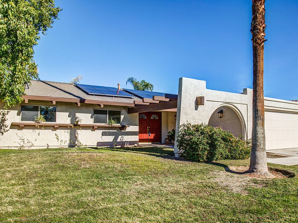 Beautifully updated 3 bedroom, plus a den or office, 2 bath, fresh paint throughout and some drywall repair, newer kitchen cabinets, new Quartz counters in the kitchen, new electric range oven, range hood as well as new dishwasher. 18 x 18 Italian Ceramic Tile floors, laid diagonally and carpet in bedrooms. Large walk in closet in master bedroom, and master bath has been updated with custom vanity, granite counter, large walk in custom tile shower with dual shower heads and diverters to rain head. Home also has a solar system on it on a power buy back program so you have minimal power bills. The large private backyard also features a pool. The gardening has also been freshened up. The FAU is also newer as well as the roof. I have not mentioned that you are a short walk to Palm Desert Middle School and Abrahm Lincoln Elementary school. Most of the windows have been replaced in the house w/ the exception of 2 and 2 sliders. This home sits in a prime neighborhood not far from fantastic schools and El Paseo with fine shopping and restaurants, you could not get a more prime location. It has just been finished and is ready for you.
