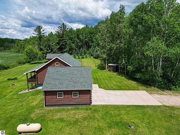 Sportperson's and nature lover's dream property! This 80 acre property contains a mixture of hardwoods, meadows, ponds and wetlands along with over 1/3 mile of frontage on a designated trout stream. Ideal habitat for Whitetail Deer, turkey, Ruffled Grouse and most Michigan Birds. Room to roam on your 4x4 or side by side. This is a premium area for hunting or wildlife watching. Nestled within an expansive 80-acre estate, this charming log home embodies the essence of rustic luxury and serene seclusion. The home's exterior exudes classic log cabin charm. The recently installed roof, only four years old, ensures durability and peace of mind for years to come. The property is a haven for nature enthusiasts and those seeking privacy, with stunning views from every angle, uninterrupted by neighboring homes. The main floor spans 1500 square feet, offering a spacious and open layout that emphasizes comfort and functionality. The heart of the home is a large living area, featuring high, exposed beam ceilings. Adjacent to the living area is a well-appointed kitchen, equipped with modern appliances and ample counter space, making meal preparation a joy. The dining area, conveniently located nearby, provides a welcoming space for family meals and entertaining guests. Ascending to the loft, you'll find an additional 900 square feet of versatile space. This area can serve as a guest suite, home office, or recreational area, adapting to your needs. The open design maintains the home's airy feel and provides panoramic views of the property from a higher vantage point. The fully finished walkout basement extends the living space, offering a seamless connection to the outdoors. Large windows and a sliding door allow natural light to penetrate the lower level, creating a bright and inviting atmosphere. Completing the property is a 32x48 pole barn with heated work shop ,a versatile structure that can serve multiple purposes.