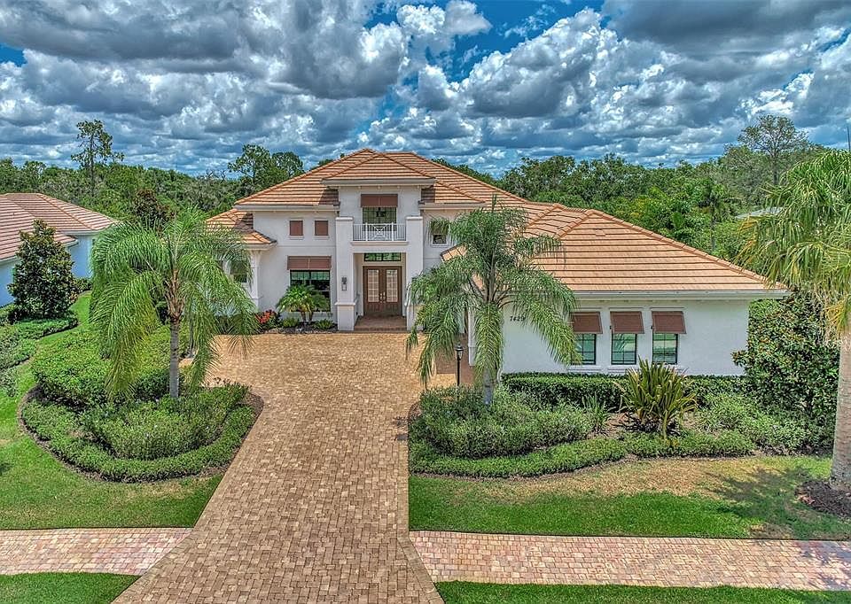Located in the highly sought after gated community of Country Club East, this modern and stylish residence offers the perfect blend of comfort and sophistication. The former Gardenia II model by Stock Homes backs up to a picturesque preserve offering a serene and private setting. The thoughtfully designed open concept kitchen, living room and dining area, with soaring 14 foot ceilings and ceramic tile flooring throughout, is ideal for entertaining family and friends. Grandeur and elegance abound the main living space of the home. The great room features endless upgrades, including crown molding, double coffered ceilings, sophisticated designer lighting, custom window treatments and a built-in wall feature. Your eye will be instantly drawn to the custom built 90-bottle glass-enclosed wine wall in the dining space. The gourmet kitchen features a massive 7’ x 10’ island, quartz countertops, gas cooktop, ample cabinet space and a walk-in pantry. Sliding pocket doors span the back of the home, adding abundant natural light to the living space and creating a seamless transition between indoor comfort and outdoor serenity. The master suite is a retreat unto itself, offering a private alcove entry, two walk-in custom closets, a spacious bedroom and sitting area with glass French doors open to the oversized screened lanai. A sweeping hallway leads you to the spa-like luxury master bathroom featuring an oversized (4.5’ x 10.5’) walk-in shower with floor to ceiling tile, two separate vanities, a free-standing soaking tub and a linen closet. Three guest bedrooms are en-suites with expansive closets, providing comfort and privacy for family and visitors. The well-appointed, stylish office, which features a soaring 12-foot custom wooden coffered ceiling, motorized blinds with custom window treatment and french doors, caters to your work-from-home needs. Just when you think you’ve seen it all, stroll down the rear hallway to a hidden oasis. The versatile, oversized family room, which features pocket sliding doors to the lanai, tray ceiling, custom drapery and motorized blinds, embodies a cozy feel perfect for a weekend movie night or just snuggling up with a good book. Freeform pool featuring sun shelf, integrated spa and two gas fire bowls with a waterfall feature. The granite topped outdoor kitchen with large island outdoor, equipped with a built-in gas grill, sink and beverage refrigerator. Enjoy a night of evening fun with integrated lighting and bistro lights in the back area, perfect for a family cornhole tournament. Additional features include laundry room that is functional with tons of cabinet space, sink, water softener and water filtration systems, hurricane impact glass throughout. State-of-the-art smart home technology including two smart thermostats, smart entry lock, home security and camera system which can all be remotely controlled. Located a short distance to the neighborhood clubhouse which includes a community room, the newly appointed gym and the largest of three community swimming pools. The neighborhood is also home to several of Lakewood Ranch Country Club’s facilities, including one of its 4 golf courses, a driving range, clubhouse restaurant and pickleball courts. Club membership has availability for a limited time following its recent 3-year waitlist. This home is centrally located and a short drive to University Town Center shops and restaurants also, nationally ranked beaches and A rated public schools.