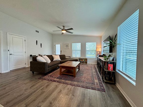 Quartz countertopsOpen floor planModern cabinetryLarge fenced in backyardStainless steel appliancesLarge master bedroom