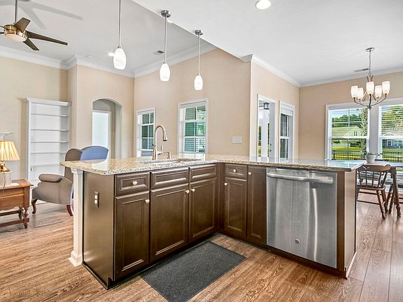 Overlooking the pond, this exceptional 3 BR/2 BA home, located in the Devonshire Estates section of Windsor Plantation, boasts a desirable open floor plan with tall ceilings, abundant light from the many windows, natural gas fireplace flanked by built-ins, an enormous kitchen, formal dining or office space, and enclosed screened porch, which is truly a 3-4 season room. This home is an entertainer's dream and perfect for those family/friends gatherings! Kitchen features include stainless appliances, stone backsplash, staggered cabinets with pull out drawers, single bowl sink, large island, pantry, and breakfast area. Highlights of the primary bedroom (also overlooking the pond) include an expansive walk-in closet, comfort height vanity with dual sinks and walk in shower in the bath. Two guest bedrooms share a bath which also has a comfort height vanity and tub/shower combo. Other amenities of this home include a laundry room with washer/dryer and cabinets, pull down attic stairs in the 2 car attached garage, extensive crown moulding and arches, outdoor fencing, professional landscaping with sprinkler system, and fenced yard. The rear enclosed porch is probably the most popular room in the house as it allows for screen or windows, depending on the time of year and season. Gorgeous views from this room and the adjoining outdoor patio. Get to know your neighbors while lounging at the Windsor Plantation pool and clubhouse! Windsor Plantation is convenient to shopping, restaurants, schools, the Intracoastal Waterway, and much more! Make your appointment today!