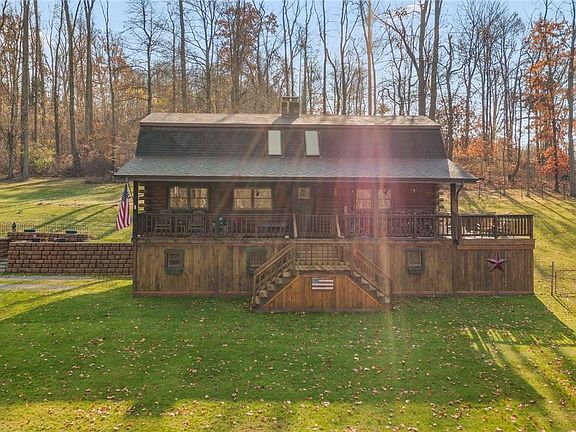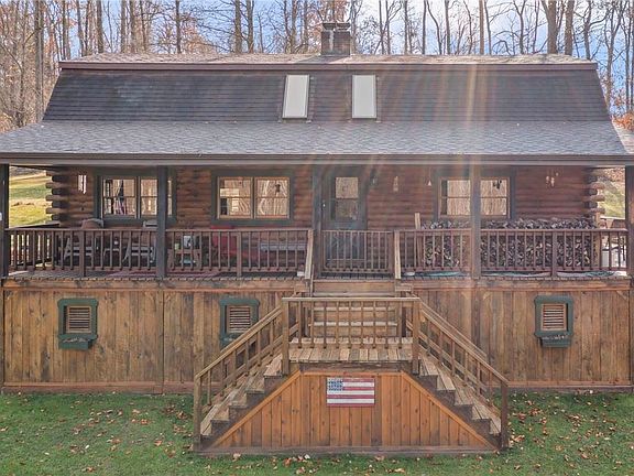 Log home on 10 fenced acres in Trinity Schools! 5 acres are cleared, and you must use a remote to get inside the gate. The wrap-around deck/porches will be the highlight of your morning coffee. Overlooking the wildlife while enjoying peacefulness and seclusion. This home sits in the country but is minutes from the highway, mall, and restaurants. This gorgeous log home has a newer, updated kitchen with granite counters, a coffee bar, stainless appliances, beamed ceilings, a stone-look tiled floor, and an island. The living room has a stacked stone chimney/wood burner to heat your house for low cost, as the home comes with fresh-cut firewood on the property, which should give you a few year's worth of free heating. The first-floor full bath has a newer walk-in shower with a grab bar and seat AND a 3-tiered vanity. 2 Large bedrooms with double closets in both. Den in lower level. Storage building for your toys! Heat pump 2022. Coyote system with 1700 gal tank.