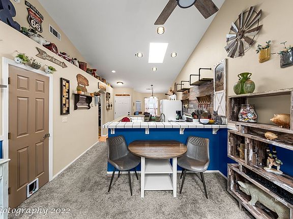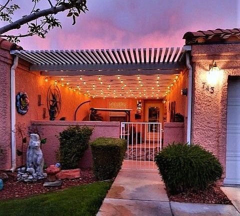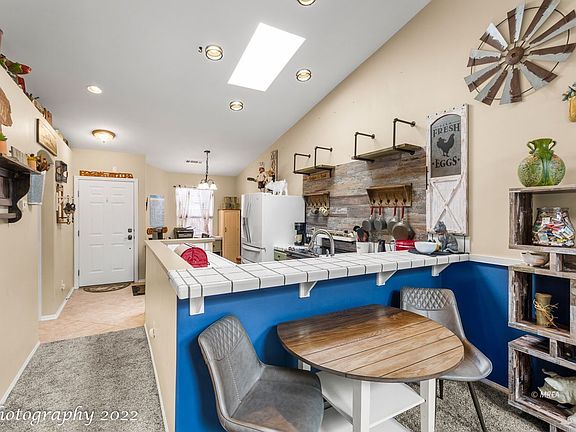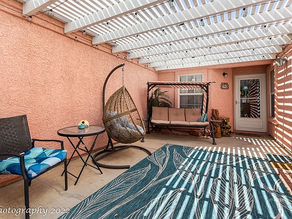 Come see this charming townhome which features many upgrades. The kitchen has new paint with decorative chair rail; kitchen backsplash and tile countertops, new stove, farmhouse sink, painted cabinets and ceiling fan. In the living room you will find new carpet, new glass doors to patio with blinds inside glass. Upgraded plank flooring in main bedroom bathroom, both bathrooms have been updated with new cabinet facings, new paint, decorative mirrors, lighting and fans. The electric fireplace has new surround and new cabinetry has been installed in laundry room. Pergolas have been added to the front courtyard and back patio where it feels like a cozy addition to your home where you can enjoy your leisure time.