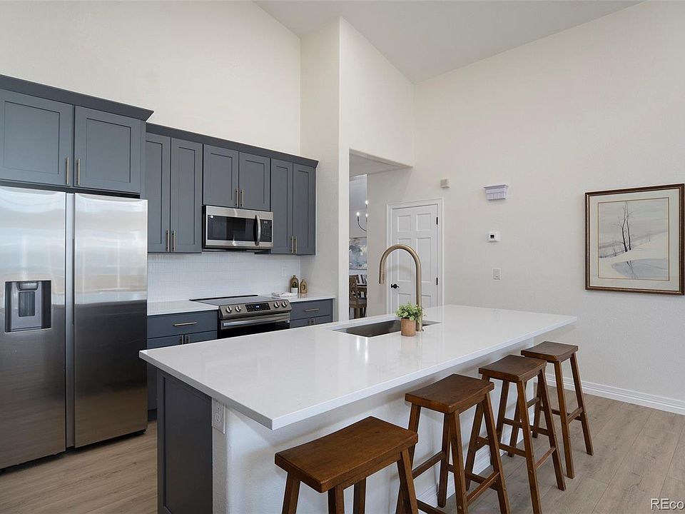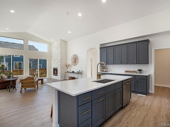 Stepping into this home you walk into the vaulted ceiling foyer and are greeted by a tasteful chandelier over the dining room, a light-filled family room and a custom steel railing. Brand new luxury flooring takes you into the wonderfully open kitchen and living room combo with massive vaulted ceilings and a wall full of South facing windows. The natural light is incredible here! The kitchen has been updated with soft close high end cabinets, quartz countertops, an eat-in island and stainless appliances. It has plenty of storage with between the cabinets and pantry. The living room has a gas fireplace with a floor-to-ceiling stone surround for cozy nights with friends and family.