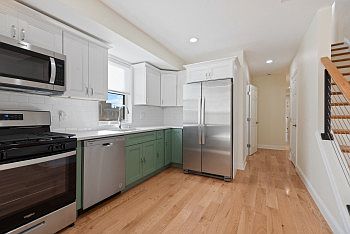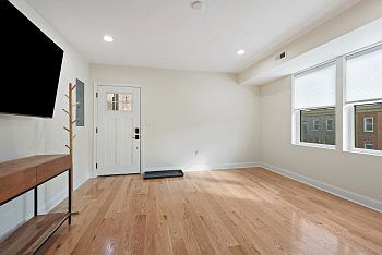 This is completely new inside. It is made of 2 floors on the second & third story of the building. It has a gorgeous one-of-a-kind design. It is a corner unit with lots of natural light. The kitchens have wood cabinets, quartz counter tops & stainless-steel appliances. It has wood floor through-out the entire unit. This unit is great for a roommate situation like professional students etc. Each has their one private bedroom & bathroom on suite oasis, & the common areas can be shared together. Great location in the heart of Canton, walking distance to restaurants, shops & grocery stores. The bus stop & Johns Hopkins Blue Shuttle stop are just a few steps away. On the first level, there is a good size kitchen with an eat in peninsula, open living & dining area with a smart tv included & a half bath. There are 2 spacious bedrooms each with its own on suite bathroom. The second level has a cozy eat in kitchen area with its own smart TV & a laundry with full size washer & dryer. There are 3 spacious bedrooms each with its own on suite. Outside the deck area is shared with Unit A. The roof top ceiling has spectacular views of Baltimore City. Rent includes electricity, water, wifi and security system. No Smoking inside. Permitted in the Roof Top Deck.
