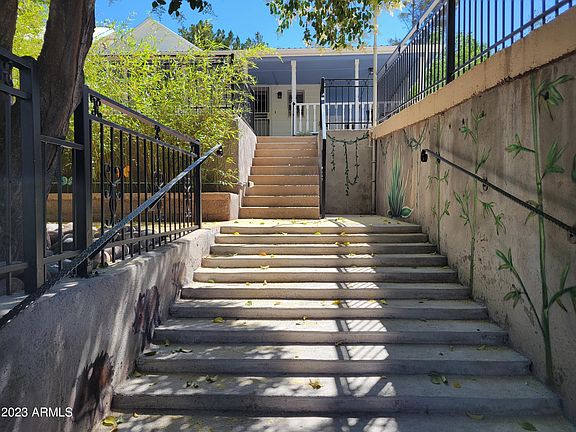 A remarkable Old Bisbee home, wrapped around a farmhouse porch. Two bedrooms with new cabinetry and replaced ceilings. Renovated Galley Kitchen and bathroom. Laundry room is located in Kitchen closet space. The Home, Ramada and Garage have been completely rewired. New plumbing in Kitchen and Bathroom to accommodate for additions. Property is terraced with intimate sitting areas. Garage is street level, a set of steps leads to outdoor seating spaces, additional stairs take you to house level and further stairs lead to the Ramada look out location. Hardscaped with room for cactus gardens and peach trees. Many more upgrades have been accomplished. . All appliances and outdoor furnishings will remain.