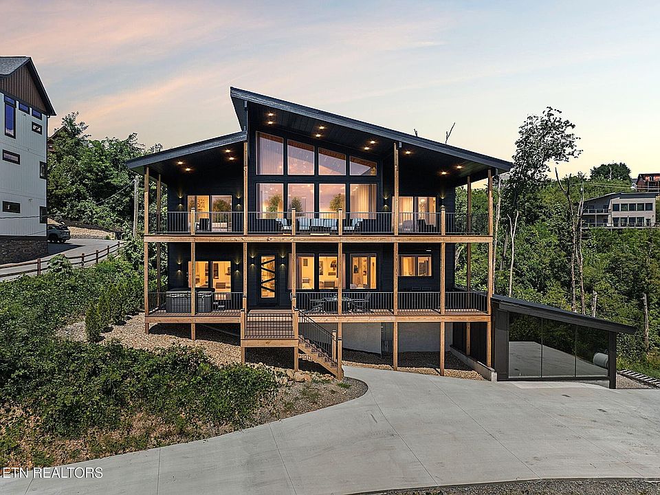 No expense spared on this modern home with rustic touches. Exterior finished for low maintenance with hardie fiber siding, composite decking and commercial grade metal roof. Windows and doors are composite or fiberglass for long term life. Interior walls and ceilings finished in custom 1 by 12' tongue and groove throughout (no drywall anywhere). Beautiful granite everywhere including multiple bar areas. Huge waterfall island in kitchen with views of Mt. LeConte from almost every room in the house.