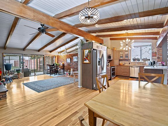 Indulge in the charm of mid-century living in this captivating tri-level house situated near Bookcliff Country Club, within the prestigious Fairway Park subdivision of North Grand Junction. This expansive property, spanning nearly an acre, offers a unique blend of privacy and sophistication, with no Home Owners Association constraints. The home has 4 bedrooms, 4 bathrooms, and nearly 2,600 square feet of thoughtfully designed space, this home is a masterpiece of classic design paired with contemporary updates. As you step inside, you're greeted by a grand vaulted ceiling adorned with rich wood beams and complemented by stylish brick accent walls—a true homage to mid-century aesthetics. Recent enhancements have elevated this residence to new heights of luxury and functionality. A new membrane roof ensures durability, while a custom cedar fence and gates enclose the southern side of the property, creating a private oasis. The newly installed boiler, water heater, and dishwasher contribute to the home's efficiency and comfort. The lower level, featuring the primary suite, is a haven of privacy and indulgence with one of three fireplaces in the home setting the tone for cozy evenings, while the stunning ensuite bath boasts a steam and rain shower, a soaking tub, and radiant in-floor heat—a true retreat within your home. The primary suite also has new flooring and opens to a newly terraced private flagstone patio and hot tub area, leading to the expansive backyard. The outdoor spaces are designed for relaxation and entertainment, with a newly revamped irrigation system, a large screened-in porch off the living room, and a stamped concrete patio with a beautiful fountain and pond. There is also an elevated firepit area for all season enjoyment. The serenity of your surroundings envelopes you throughout the meticulously landscaped areas. Parking and storage are abundant with a large 2-car detached garage and an attached 23' x 12' flex room, perfect for a shop or recreation space, and a 19' x 12' storage shed—ideal for your golf cart or other toys. The kitchen is a chef's delight, featuring updated cabinetry, fixtures, as well as granite and butcher block counters. This home offers a lifestyle of comfort, elegance, and versatility. Seize the opportunity to own this updated mid-century gem. Schedule your showing and step into a world where classic design meets modern luxury.