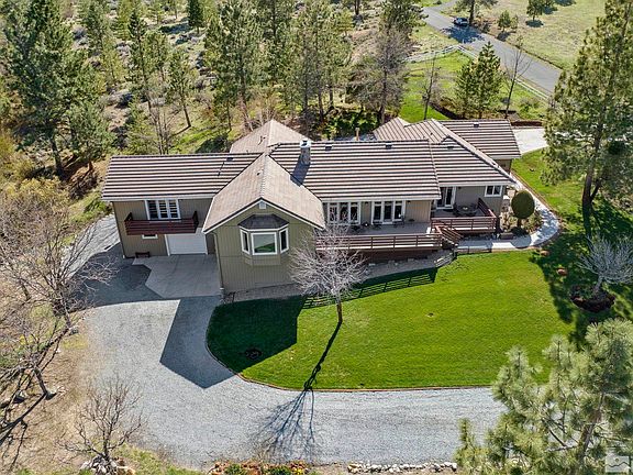 Situated on five acres with picturesque views of Washoe Lake, this extraordinary home combines impressive interiors with exceptional exterior. The main living area showcases radiant natural light with vaulted plank ceilings, large windows, an open concept plan complete with a stone fireplace, and authentic wood flooring. The spacious kitchen features granite countertops, custom built pullouts, solid cabinetry, Viking stove, and a delightful breakfast bar., Enter the large primary bedroom suite and you will find lofty ceilings, large picture windows with a view of Washoe Lake, and convenient deck access. Additional bedrooms, one of which contains a murphy bed, provide ample space for any lifestyle. Other thoughtful amenities include speakers throughout the home, top of the line water filtration system, and an oversized bonus room complete with wired theatre sound, a bar area, and private deck perfect for entertaining! Green grass, seasonal stream, and an abundance of trees and flowers, and fully fenced raised garden with irrigation system add to the enchanting feel of this beautiful property. This property contains 11 cars worth of attached garage and workshop space! If you are looking for a home that can do it all, congratulations...you've found it!
