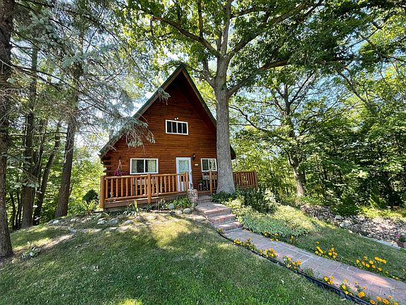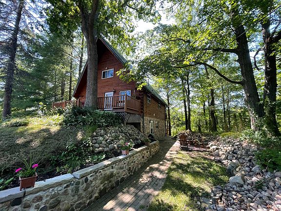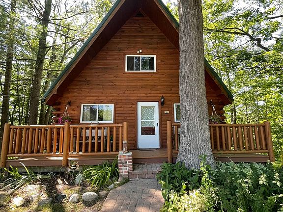 Just in time for fall fires and color tours from the comfort of your pontoon, This 4 bedroom, 2 bath, log sided chalet is perfectly positioned on three spacious lots totaling over 1 acre. The cumulative lake frontage of these parcels is over 300' making it one of the largest contiguous tracts on the lake. The home itself offers great rustic touches and plenty of privacy at the end of a dead end street on a hardwood bluff over looking the lake. Enjoy outdoor living at its finest with a walkout basement, brick patio with built in fire pit and several levels of decking going down to the waters edge. Five Lakes is a 118 acre all-sports lake with a diverse fish population, loons, herons and swans. This property is also able to be used as a short-term vacation rental for those looking to invest. Don't miss out at this newly reduced price.