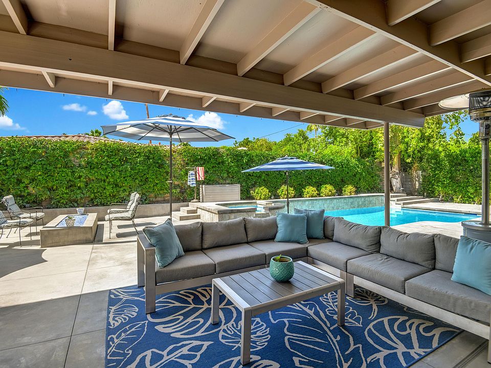 This Beautiful Palm Desert Remodeled Pool Home has Arrived! Every detail has been attended to with this Modern Style home with sophistication. As you enter this home you are greeted by a large open and spacious floor plan, the kitchen includes stainless steel appliances, large center island with Quartz countertops, White cabinets, gas cooktop and range hood, white tile for a clean sleek look! The Living Room is an open floor plan to the kitchen and dining area, new sliders that take you out to your private Oasis! Covered patio, large heated pool, jetted Spa, Mister system, Fire Pit, Gas hook ups for BBQ, mature landscaping for privacy, and a side yard with grass turf. The Master Bathroom features a large all glass shower with custom tile work, double sink Vanity with Quartz counter top and white cabinets, the Guest Bathroom features the same Vanity with a single sink and a tub / shower combo, all the bedrooms have carpet, glass closet doors, grey shades, and ceiling fans, the remainder of the home features wood like tile throughout, every room has been carefully planned and detailed with their design of this remodel. Other features include an indoor laundry area, detached 2 car garage, newer Ac Units, Water heater, all new wired Electrical, Lighting, inte