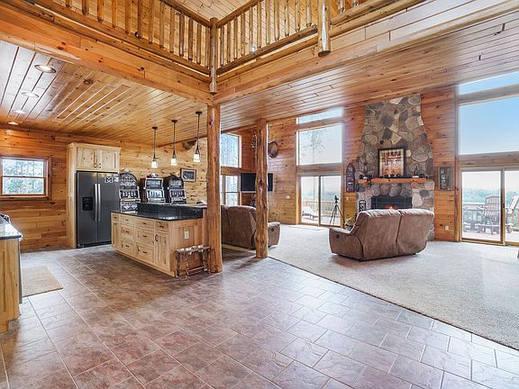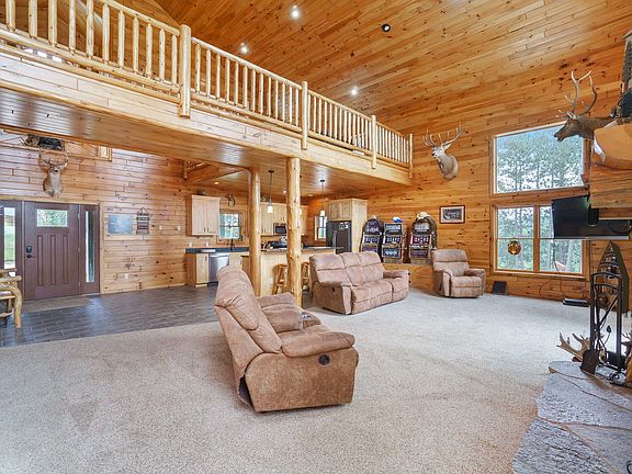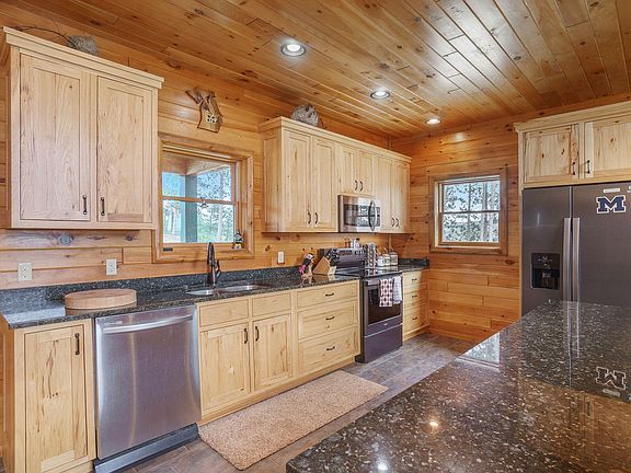 Scenic Ranch perfectly situated on top of 120 acres w/ frontage on Hopkins Creek & ponds. Half Log Chalet style, 2 story walkout built in 2013 & a Barndominium in 2018 offering 2nd dwelling & a pole barn. All the features you'd expect. Stunning elevation setting, hundreds of pines, gated & fenced. Unobstructed views, expansive deck, fieldstone fireplace, handsome wood log features, floor to ceiling windows, granite counters & an open concept kitchen w/large island. Private master suite upstairs w/walk-in closet & lovely bathroom. Loft has Billiards area. 2 Car garage in walkout level. Barndominium for more guests & storage for the toys. Centrally located & 34 miles from Traverse City, close to airports & highway. Business opportunity available: Hopkins Creek Whitetails Ranch. MLS#