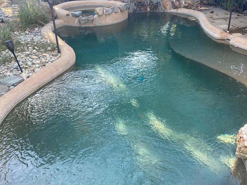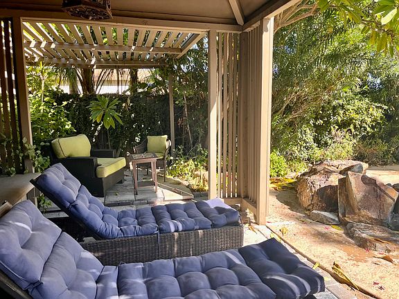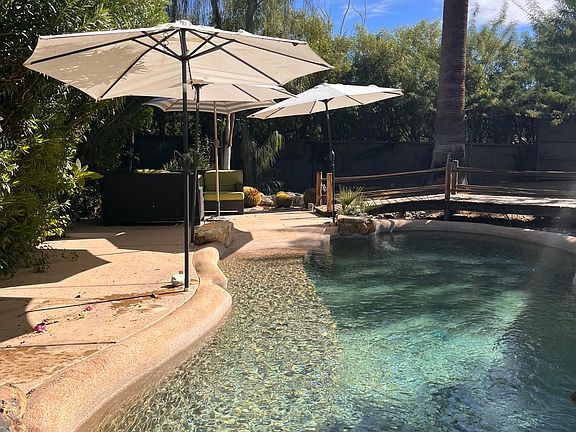 Artistically landscaped, this home is a stunning departure from the average. Picturesque charm is evident from the modern interior design through to the exotic gardens. Enticing private Gazebo with cozy seating area, sparkling private pool with spa and fountain, elevated wooden bridge walkway leads to pool, inviting patio off dining area, the flagstone pathways meandering through the grounds all combine to provide an entertainer's paradise. This fascinating home offers an open plan living room/dining combination, high vaulted ceilings, modern kitchen with new marble counters, porcelain tile throughout plus spectacular views of the pool and grounds. Two generous bedrooms, each opens out to either the front private patio or back patio. One bath, totally remodeled with extra large tub, plus an additional convenient exterior shower on the private patio. Separate office with superb views of the gardens and pool sits off the garage. Double garage, large auxiliary parking space next to garage.