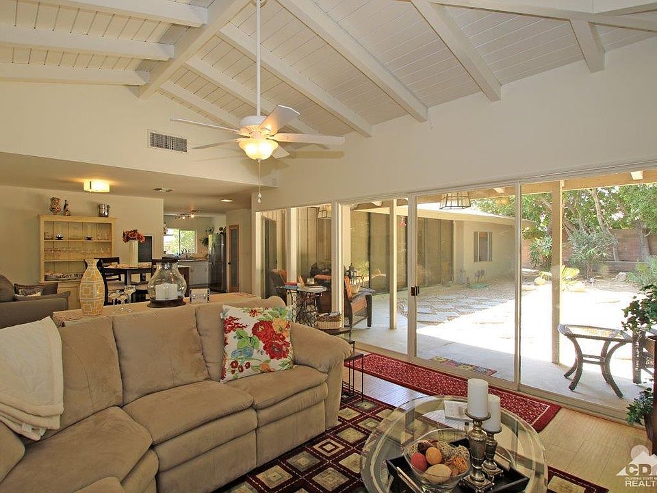 Fabulous Mid Century home boasting 2 bedroom,2 bath, Wood Beamed Ceilings in living room and Master bedroom!The Master Bedroom is en suite with a bathroom and deep walk in closet! Gorgeous wood laminate floors throughout! The living room has a fireplace and Walls of Glass overlooking the private enclosed backyard complete with fountain! The kitchen has Stainless Steel Appliances including Wine Refrigerator! Beautiful Built In Office also overlooking the backyard! Fully air conditioned and also has a Desert Cooler! This home comes equipped with Ceiling Fans, Refrigerator, Washer/Dryer, Storage Shed and Alarm System! Great curb appeal with lush landscaping and circular driveway! Incredible South Palm Desert location walking distance to El Paseo with the Very finest in Shopping, Art Galleries and Fine Dining! Home is in Washington Charter School District!! Available Unfurnished 10/1/16 at $1,675 per month!