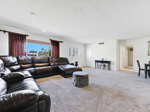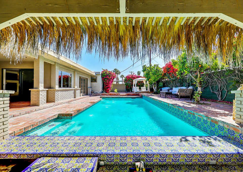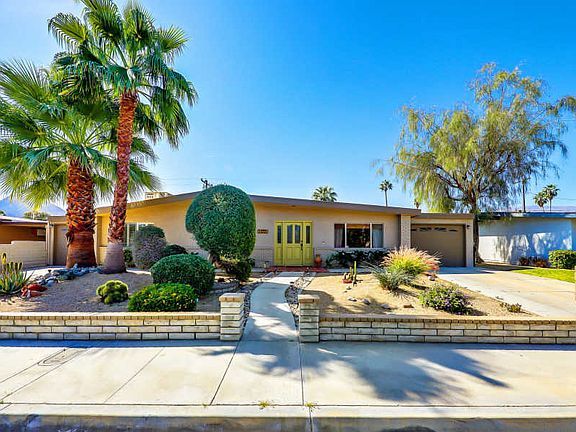 This mid-century South Palm Desert pool home has unique custom touches and a Santa Barbara feel that is ideal for entertaining. The layout features separation between the guest bedrooms and Owner's suite. The oversized Owner's suite has a walk-in closet and a spa inspired en suite bathroom that includes a custom tile sunken shower and blue glass windows. The kitchen has slab granite countertops and tons of storage and opens onto the living room with bar area, marble faced fireplace, and built-in bookshelves and display cases. Both a sliding door and French doors lead to the lush South-facing backyard the embodies the very best of Desert outdoor living. The covered patio has a pass-thru from the kitchen and Saltillo tile flooring. The sparkling pool is surrounded by brick, a raised sunning deck, colorful tile accents, and arching deck jets for a true resort feel. The crown jewel is the swimup bar with submerged stools and large serving area with wet bar covered with a palapa. Two attached garages with an additional room for an artist's studio or workshop. Located blocks from the renowned George Washington Charter Elementary School and famed El Paseo Shopping District. No HOA fees.