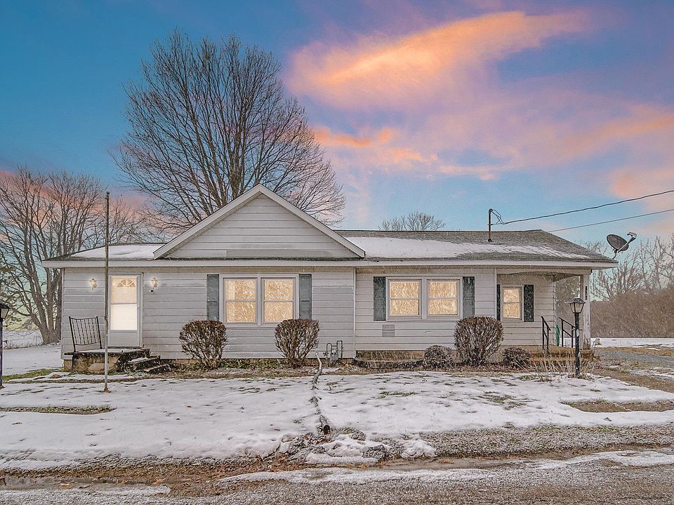 House in the country on a over an acre in a very quiet area. Two bedroom , 1 bath home, with main floor laundry. The house has a lot of options for future improvements, huge living room , large dining room , nice sized bedrooms and tons of closet space! There is a heated porch that could easily be another room for additional living, and basement for plenty of storage. With a little TLC this home has tons of possibilities.