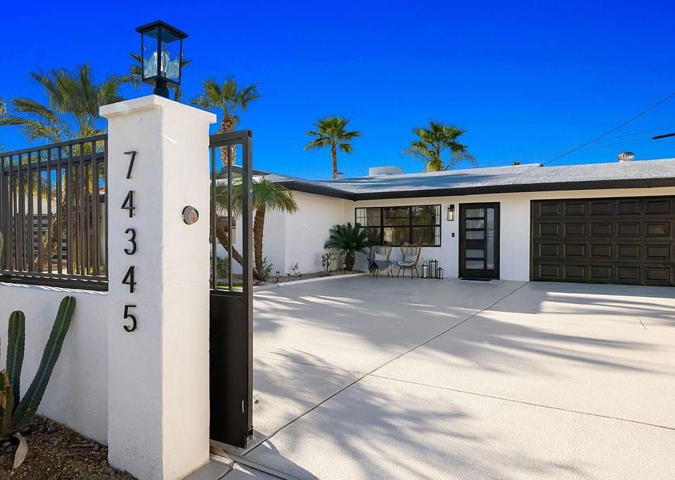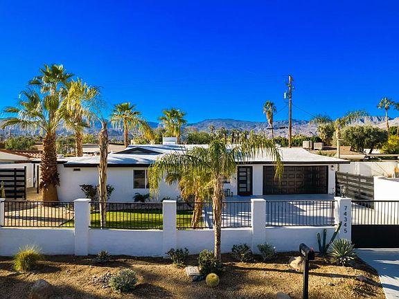 Enter into the light and bright open floor plan of this fully renovated mid-century home in the heart of Palm Desert and fall in love with the quality craftsmanship, finishing details, and backyard pool living space. This 3-bedroom, 2 bath home boasts countless upgrades including brand new tankless water heater, new electrical & plumbing, ducting, bathrooms, flooring & premium carpets. All new interior and exterior paint, custom baths including walk-in shower & soaking tub in main bedroom bath, recessed LED lighting throughout, new ceiling fans in all rooms/living room and all new light fixtures. Two partial exposed wood ceiling beams in living area for open living. Built in Electric Fireplace and entertainment wall creates a cozy living space. Front Security gate entrance with remote opening with Ring Camera. The kitchen boasts Miele appliance dishwasher, double oven & warmer, and Sub Zero refrigerator. Large kitchen island with premium quartz countertop, Julien Stainless Sink and Dornbracht Faucet. The outdoor dining, living area along with built-in BBQ, Salt Water Pebble Tech Pool & hammocks allow you to enjoy the desert living lifestyle. Centrally located and close to El Paseo, shopping, schools and civic center park. Square footage to be verified.