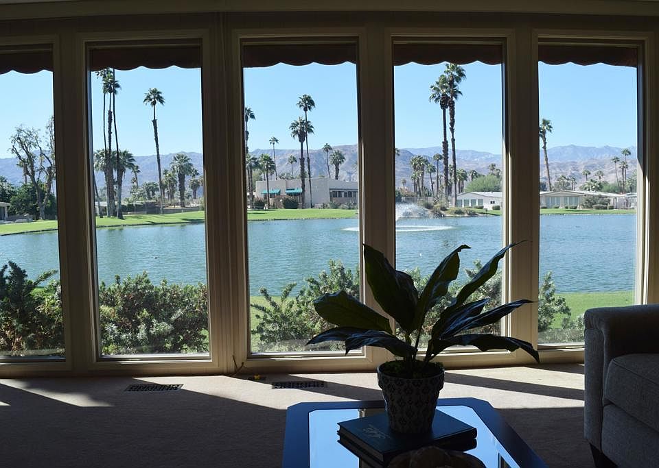 This property has a 433A completed and is ready for finance. LOCATION is everything. Portola Country Club is located in the middle of Palm Desert. And this property is located on one of the best locations in the Club! Living at Portola CC, you are minutes away from El Paseo which boasts of fine dining and wonderful shopping experiences. College of the Desert and McCallum Theatre which presents world famous performances are about 1 mile away. Want views? The living room ceiling to floor windows open to a panoramic view of the mountains, lake, golf course, and clubhouse. Wild life flourish here. Upgraded new Milgard windows and sliding glass door installed in 2018. Beautiful awnings have been added for a custom look. Enjoy the amenities that this club offers including an active clubhouse, golf, tennis, 3 large pools with Spas, Bocce Ball and more. Come see this property and get ready to enjoy the lifestyle this active 55+ community has to offer.