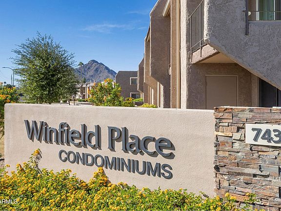 Best Value in Winfield Place! Tucked poolside in the lush, well-kept community of Winfield Place, this ground-level remodeled end unit offers Scottsdale living made easy. Just steps from the Arizona Canal Trail and minutes to Fashion Square, the location blends resort-style serenity with unbeatable walkability. Inside, enjoy dual-pane windows; including an extra in the kitchen for added natural light, white tile floors, plush bedroom carpet, granite countertops, solid wood cabinetry, and generous closet space. The upgraded bathroom features a custom-tiled walk-in shower with bench and a tall vanity, ideal for snowbirds or year-round comfort. Step outside to your private covered patio with bonus storage and a front security door for peace of mind. With two heated pools, spas, a remodeled clubhouse, and beautifully maintained desert and green landscaping, Winfield Place offers the perfect mix of lifestyle and value, whether you're seeking a seasonal escape or a full-time low-maintenance home.