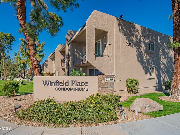 Immaculate and ready to move in condo in very desirable Old Town Scottsdale location. Quiet interior unit, steps away from community pool/spa. Granite countertops in kitchen & updated baths. Recessed lighting thru-out, wood laminate & custom paint. Full stacked washer/dryer in unit. Tiled and kitchen, hall & baths, custom window treatments, walk in master closet. Cozy fireplace. South Facing patio overlooks professionally manicured grounds. Winfield Place is a lush oasis right on the canal and 1/3 mile from Fashion Square. Two heated pool/spas, remodeled clubhouse. Walkable to everything Old Town, restaurants & entertainment. Enjoy biking and walking on the Scottsdale Waterfront! Make this home your bright winter retreat with countless onsite amenities of Winfield.