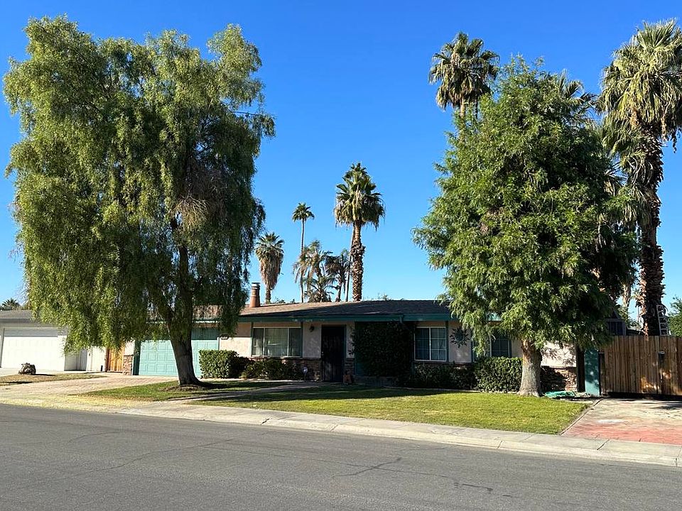 Wow! Quaint mid century pool home for under $500,000 on a generous lot with NO HOA! The interior welcomes you with a cozy living room complete with a timeless fireplace, ideal for creating a warm ambiance on those cooler desert evenings. Vaulted ceilings are featured in the bedrooms and the main living area as well as engineered wood flooring throughout. This home includes solar with updated HVAC system, water heater and pool equipment as well as dual pane windows. There is a large permitted addition being used as an entertainment room. The large attached two car garage includes a work bench plus there is a second driveway with potential side yard parking for your toys. Buyer to check city regulations. Located in Palm Desert this property provides easy access to a plethora of outdoor activities catering to the avid hiker and golfer alike, as well as the walking trail to the Palm Desert Civic Center all within a stone's throw of your doorstep.Enjoy upscale shopping and dining in the renowned El Paseo district, only minutes away, adding a touch of luxury to your daily life.Don't let this opportunity pass you by! Affordably priced, this is your chance to own a piece of Palm Desert history. Schedule a private viewing today and transform this vintage gem into your very own desert oasis.