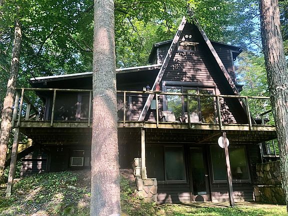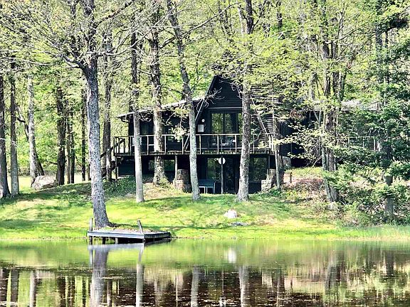 A rare Natural Wildlife retreat on 33 Acres with water frontage on large pond. No crowded water frontage here with trails and hide a way guest cottage, sugar bush, small barn with field, a perfect setting or mini-farm or vacation / year round home. Currently has shop for Jaguar restoration operational for 2 generations, designated as commercial for continued small business. Wander trails along the beautiful pond into the forest. Modified A-Frame offers year round living with spectacular pond views from the sprawling screened porch and a front deck. Property being sold as is with some limieted maintenance required. One of a kind property offeres fabulous setting and land.