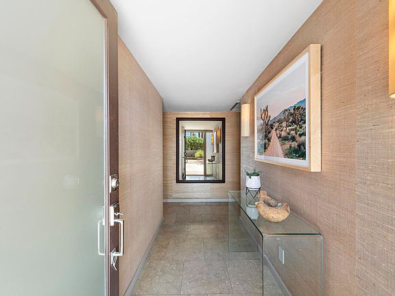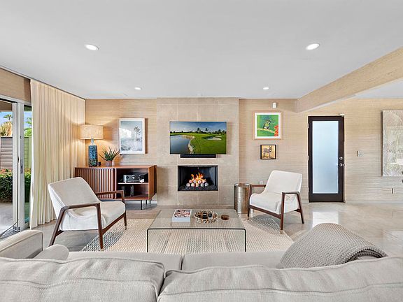 Nestled amidst the lush, tranquil surroundings of South Palm Desert, this sophisticated updated mid-century property embodies the very essence of timeless elegance and modern comfort. This meticulously designed home is debuting to the market and being offered turnkey furnished. This beauty is done to perfection with an open and spacious concept, living room, den, dining area, three bedrooms, two bathrooms, all with immediate access to enjoy the outdoors. The living room extends out to a private covered patio area with impressive stackable Fleetwood sliders that extend out creating an extension between the interior and outdoor patio. The dining area seamlessly connects to the living space, offering an ideal setting for dinner parties, gatherings with an attached outdoor BBQ area. A cozy fireplace serves as the focal point, creating an intimate atmosphere perfect for both entertaining guests and quiet relaxation. Turkish limestone flooring throughout with carpet in bedrooms. The home's thoughtful design allows for seamless indoor-outdoor living, making it a retreat for those who appreciate both style and functionality. There is a wonderful bubbling fountain and sitting area outside the primary bedroom. A meticulously landscaped garden surrounds the property, providing a sense of privacy and serenity. The pool, spa and outdoor lounge area are perfect for enjoying the desert sunshine, reading, yoga and with a covered patio offering a shaded retreat.
