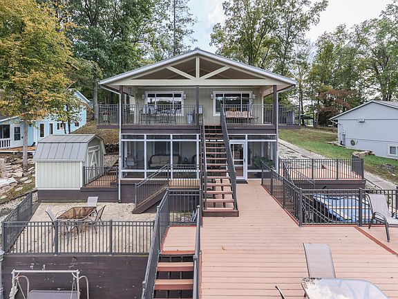 Cordry lake home RIGHT ON THE WATER! 2 bedrooms, 2 full baths and 2 additional bonus rooms. The light, bright and tasteful kitchen and adjoining dining area overlooks the gorgeous lake views. Main level family room accented with knotty pine cathedral ceilings is roomy and has a cozy wood burning fireplace. Updated main level full bath is a nice touch. The high vaulted knotty pine ceilings are carried into the main level bedrooms. The lower level walkout basement will offer a wide variety of lake experiences. The 30X17 lower level family room has its own fireplace and bar, with refrigerator, microwave and surround sound stereo. Both bonus rooms are situated nearby and can serve multiple uses for family or lake guests. Outside is where 7438 Haw Drive hits another home run! NEW 28 foot full length lakeside screened porch is perfect anytime of any season. Plan to enjoy and take full advantage of the NEW hot tub, too. The multiple composite decks with custom railings give the new owners the options of large gatherings, with room to spare. Massive 32x24 upper level party deck is perfect for working on your tan,having a barbeque or watching the boaters. Separate area for outdoor fire pit adds to additional seasonal lake memories. Two boat lifts are under the party deck, one for set for a pontoon and the other for a speed boat. Well thought out " dock garage" will house all of your lake toys and floats.. The beautiful lakeside stone work is impressive adding value to the shoreline. There's even a sand beach for your little ones to enjoy! Lots of parking and the oversized 2 car garage and garage work room will store all of your essentials. The lake side mini barn is great for additional storage. Plan your tour and start making your own lake memories now!