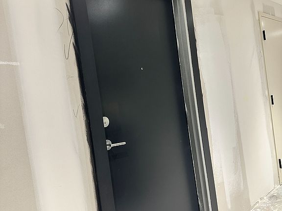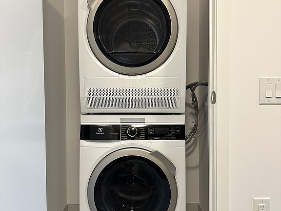 Sleek kitchenQuartz countersFull-size stainless steel appliancesFloor-to-ceiling windowsPrivate balcony