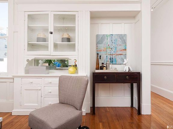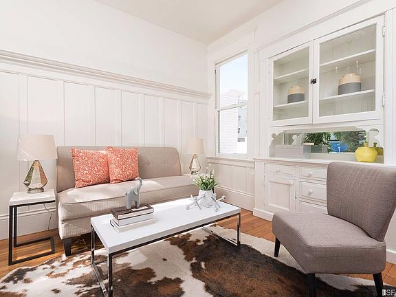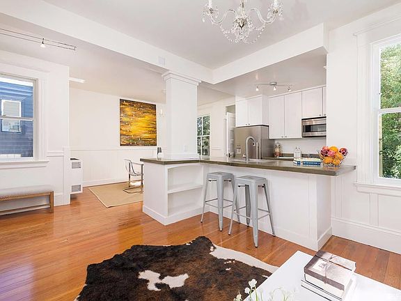 This full-floor 2BR/1BA oasis blends contemporary updates and Edwardian charm. Wainscoting detail and hardwood flooring adorn the condo, the front bedroom and living room boast light-filled bay windows. The spacious living room has an original decorative fireplace with an early 1900s tiled hearth. The flexible layout offers multiple options for configuration; off the living room is a second bedroom with original pocket doors great for use as a double parlor. The back of the home comprises the open kitchen, family room, and dining area. The kitchen boasts stainless steel appliances, concrete countertops, and breakfast bar. The full BR has a restored clawfoot tub and concrete countertop. The laundry room offers a w/d and additional storage.