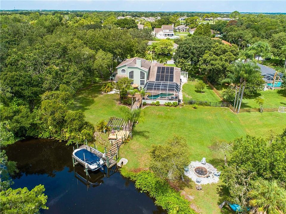 Space, privacy, and life along the Manatee River await at this beautiful four-bedroom home in Hidden Oaks. Nestled on nearly 1.5 acres of boatable waterfront, the meticulously cared for home dazzles with both it's serene, yet convenient location and it's impossibly spacious interior. Soaring ceilings, and a thoughtful layout, cater to everyday living and effortless entertaining. Host family and friends on an oversized, enclosed paver terrace with heated saltwater Pebble-Tec pool, covered area for dining, plenty of room to lounge, and breathtaking natural vistas at every turn. Fenced greenspace is great for family activities and pets or settle in for smores by the fire pit, and a private dock with 10k-lb lift will have you down the river and out to the Gulf of Mexico for a day of adventure. A great room with cozy fireplace and remote-controlled blinds is the perfect locale for a cup of tea and a good book on chillier winter nights, and a large kitchen will certainly be the hub of the home with quartz countertops and updated stainless steel appliances. All bedrooms are generous in size with abundant natural light and plantation shutters, an in-law suite offers tremendous flexibility for multigenerational living with access to a second lanai. A home office with a built-in desk, and large windows is your work-from-home haven. Additional features of note are the newer A/C system (2019), 3.5-car garage, UV and impact treatment on all windows and backyard kayak launch. Hidden Oaks is a deed-restricted community with no CDD fee. A bonus includes the community boat launch as needed.