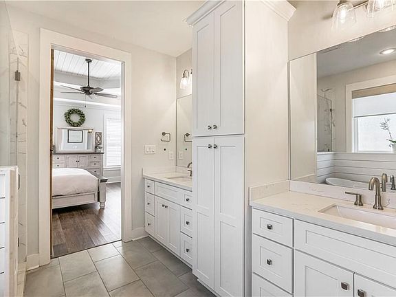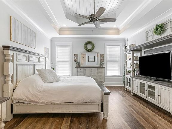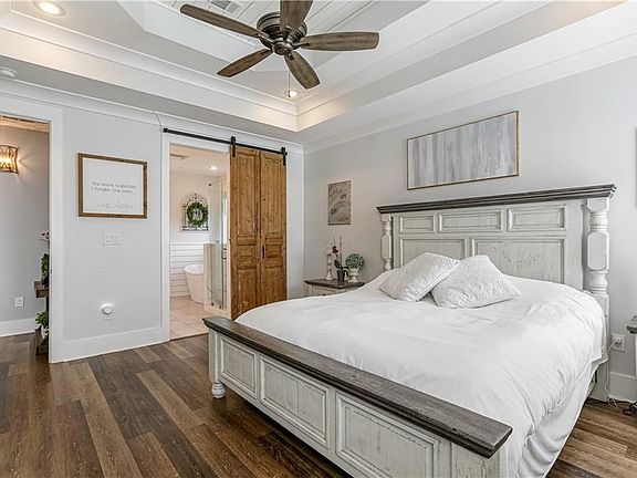 The floorplan you've always wanted! Soaring 12' ceilings. 4 bedrooms PLUS office. Delightful quartzite & stainless kitchen. Designer touches throughout to include pine beams, accent wall, reclaimed wood doors & brick fireplace. Luxurious primary suite w/ soaker tub ,custom tile shower. Walk-through access from primary closet to laundry. Outdoor kitchen with custom wood plank ceiling opens to full bath for convenience. 9' x 16' attached storage closet. Vinyl plank floors. Two community pools & much more!