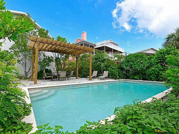 Stand between the sand dunes and sea oats as you watch the sun melt into the azure blue Gulf of Mexico; then, as darkness fills Bean Point, walk between the dunes in showers of moonlight and feel the kiss of a gentle Gulf breeze. That is your environment at Sundance Cottage. TO SEE MORE OF THIS BEAUTIFUL ENVIRONMENT AND SUNDANCE COTTAGE, VIEW THE AERIAL VIDEO TOUR. The wrap-around porch offers shaded views from the elevated, and completely equipped and supplied, 3-bedroom/2-bath beach house. This turn-key vacation-rental features interior design and furnishing by Egret's landing which supplies a convenient blend of functional utility and tasteful ambiance. The Mike Miller-designed landscaping graces both front and spacious back yard with only native plants and trees that save the owner substantial time and money to maintain. These tropical plantings surround the generous, salt-water pool, and shaded area under the pergola. The large, enclosed storage and workshop area has more than ample space to store your beach toys, wagons and portable beach chairs and canopies. Beach access is just across quiet North Shore Drive and then a short walk through the dunes and to the beautiful beach at Bean Pointe. This beach has made Anna Maria one of the world's most desired beach destinations. Leave up to four cars in the covered parking under Sundance Cottage and take the trolley to the many shops, galleries and restaurants on Pine Avenue and the rest of Anna Maria Island.