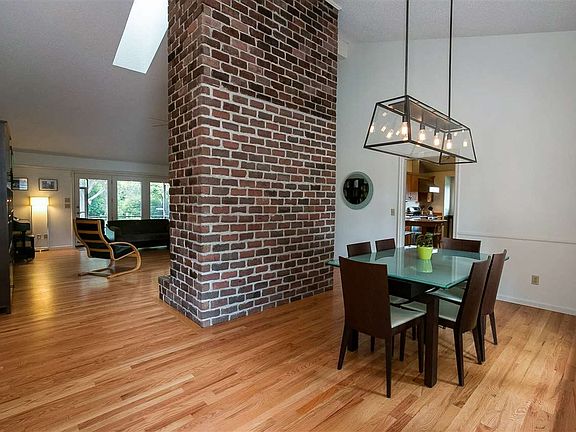 SOPHISTICATED & STYLISH ranch-style home situated on private, park-like setting. Numerous improvements: wood flrs on main level, dining rm/ living rm opened w/ dramatic brick-faced flr to ceiling frpl between, DR w/ Restoration Hardware contemporary chandelier & kitchen picture window adding light & views. Architectural details w/ vaulted ceilings & beams; open/spacious rms w/ private master suite w/ porch access, eat-in kitchen w/ new ss appls, main flr laundry & LL (non-conforming) 4th guest bdrm & bth.